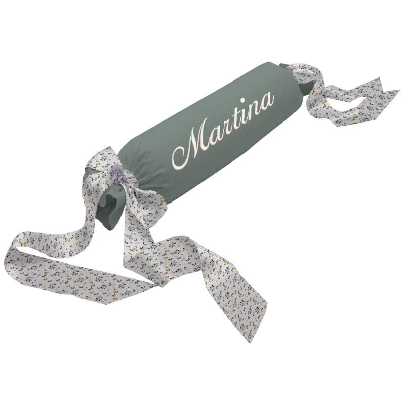 El color del bordado será un tono que vaya a juego con el color del cojín y el tono de los lazos
