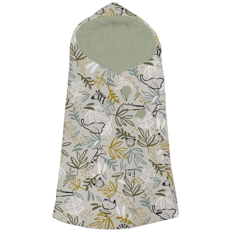 Es un saco cruzado, en la zona de la cabecita en forma de capucha para que quede más arropado.