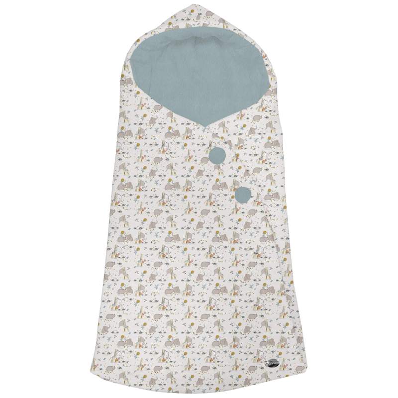 Es un saco cruzado, en la zona de la cabecita en forma de capucha para que quede más arropado.