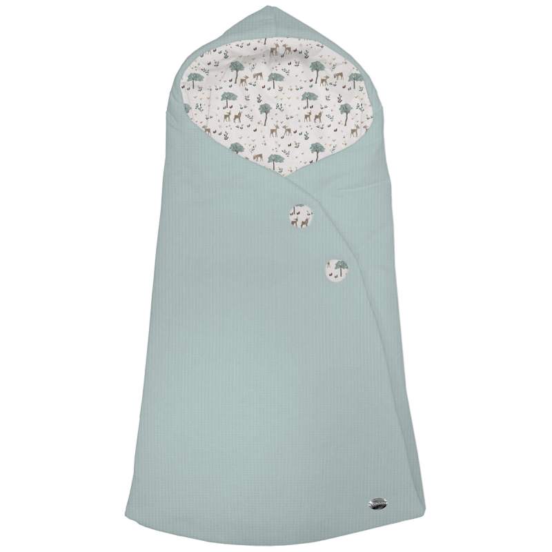 Es un saco cruzado, en la zona de la cabecita en forma de capucha para que quede más arropado.