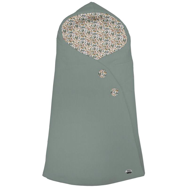 Es un saco cruzado, en la zona de la cabecita en forma de capucha para que quede más arropado.