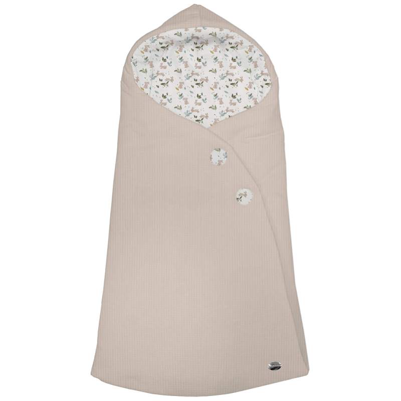 Es un saco cruzado, en la zona de la cabecita en forma de capucha para que quede más arropado.